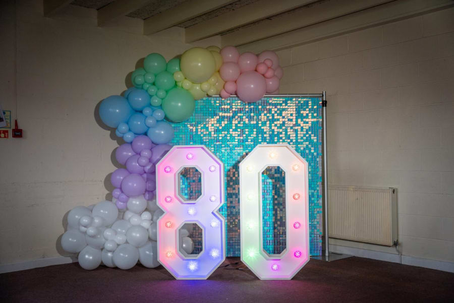 The Giant Number 80 is often the focal point of milestone birthdays, positioned beside a cake table, near the marquee entrance, or alongside the 12x12ft Dance Floor. With adaptable bulb colours, you can choose elegant whites and golds for formal anniversaries or brighter colours for fun-filled parties.